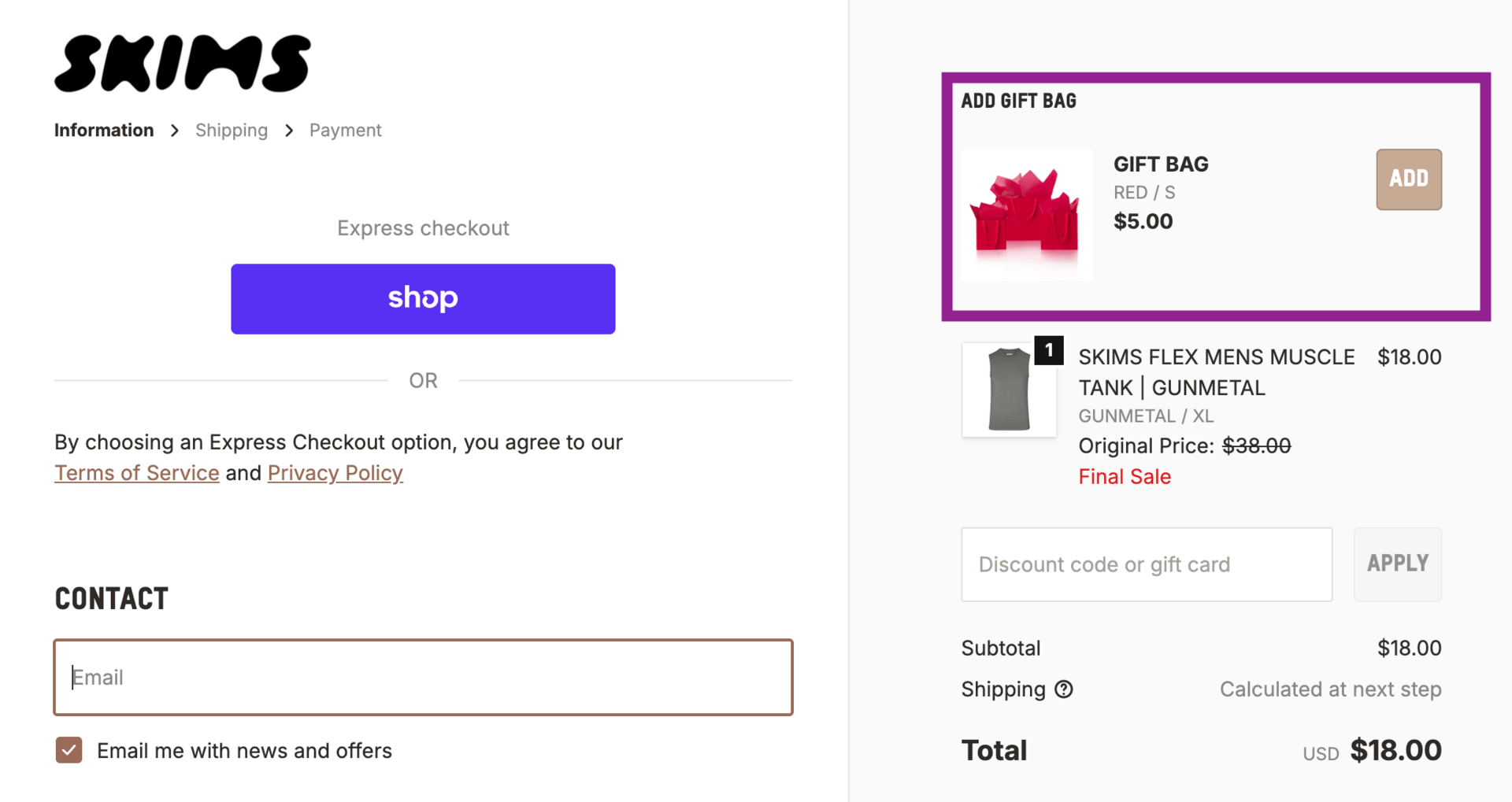 Bonus points here: SKIMS shows the gift bag option on their checkout page, too.